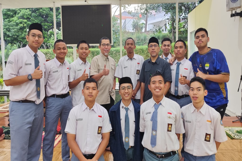 Momentum foto bersama siswa SMA DTBS Putra bersama Profesor Anom Bowolaksono, Ph.D dan Dr.rer.nat Mufti P. Patria setelah kegiatan Sosialisasi Simak UI pada (30/7/2024) di Masjid Rahmatanlil’alaamiin Eco Pesantren 1 Daarut Tauhiid.