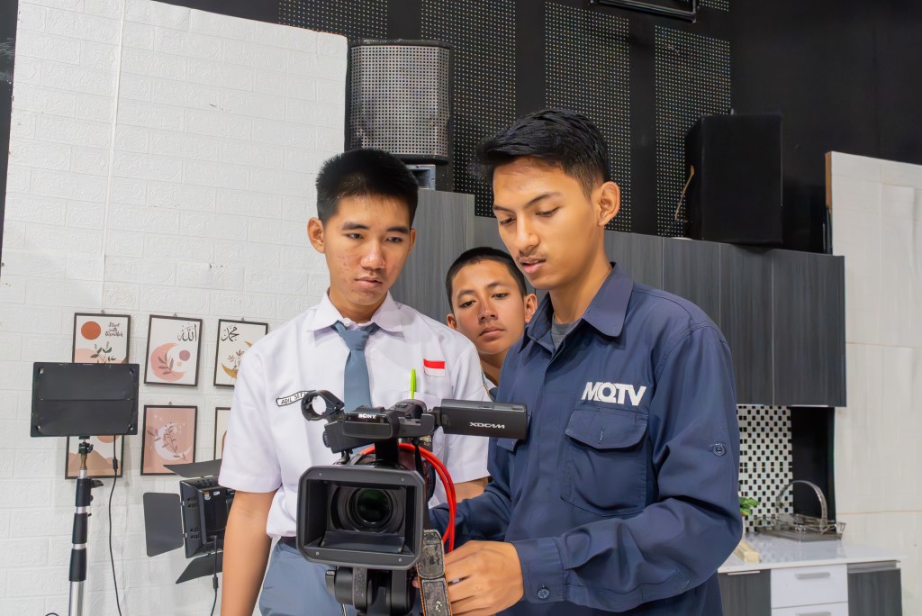 Potret santri SMA DTBS Putra mempraktikkan alat produksi televisi dipandu kru MQTV saat mengikuti kelas broadcasting pada (11/11/2025) di Studio MQTV Bandung.